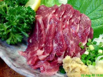 Close-up on the Horse Sashimi. Before you think it must be bloody and chewy..let me tell you that this Horse Sashimi actually tastes like cooked meat. And the most surprising thing is that even someone like me who doesn't take sashimi, do not find this raw horse meat weird.